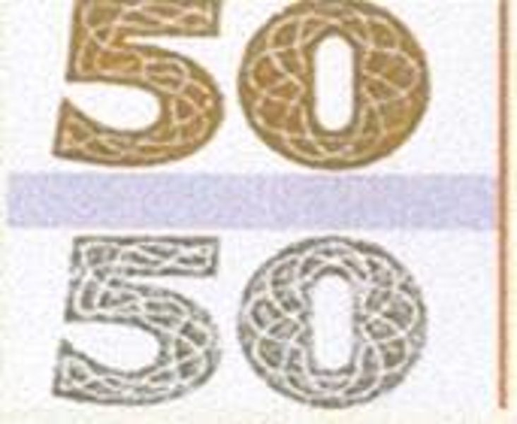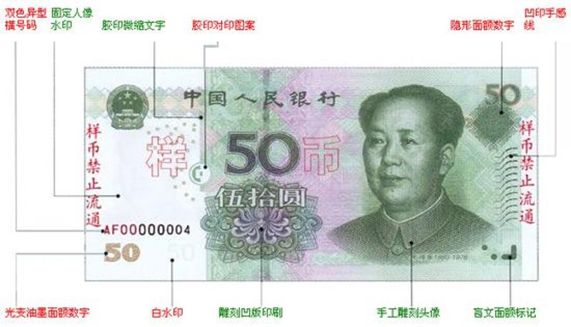 (1)白水印:位于正面双色异形横号码下方,迎光透视,可以看到透光性很强的水印“50”字样。