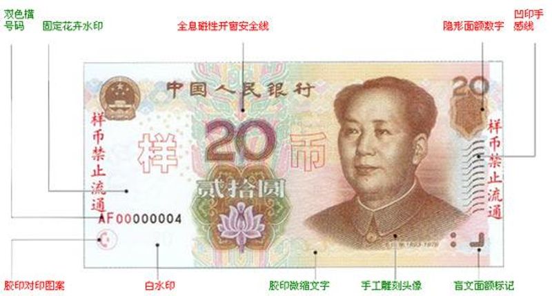 (1)白水印:位于正面双色横号码下方,迎光透视,可以看到透光性很强的水印“20”字样。