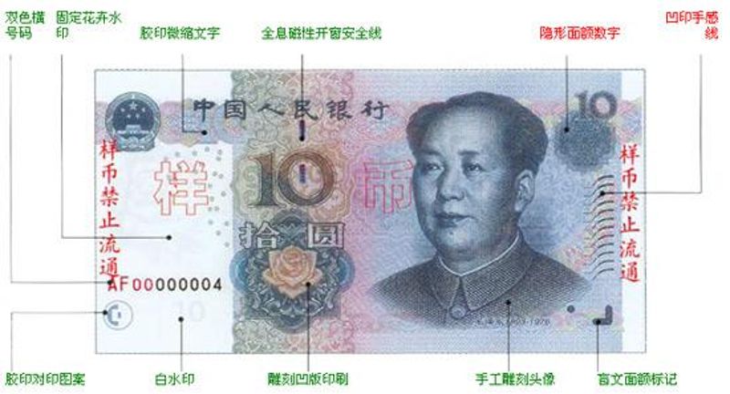 第五套人民币纸币各券别正面主景均为毛泽东头像,采用手工雕刻凹版印刷工艺,形象逼真、传神,凹凸感强,易于识别。