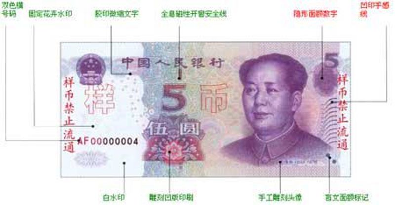 第五套人民币纸币在各券别票面正面中间偏左,均有一条安全线。100元、50元纸币的安全线,迎光透视,分别可以看到缩微文字“RMB100”、“RMB50”的微小文字,仪器检测均有磁性;20元纸币,迎光透视,是一条明暗相间的安全线,10元、5元纸币安全线为全息磁性开窗式安全线,即安全线局部埋入纸张中,局部裸露在纸面上,开窗部分分别可以看到由微缩字符“¥10”、“¥5”组成的全息图案,仪器检测有磁性。